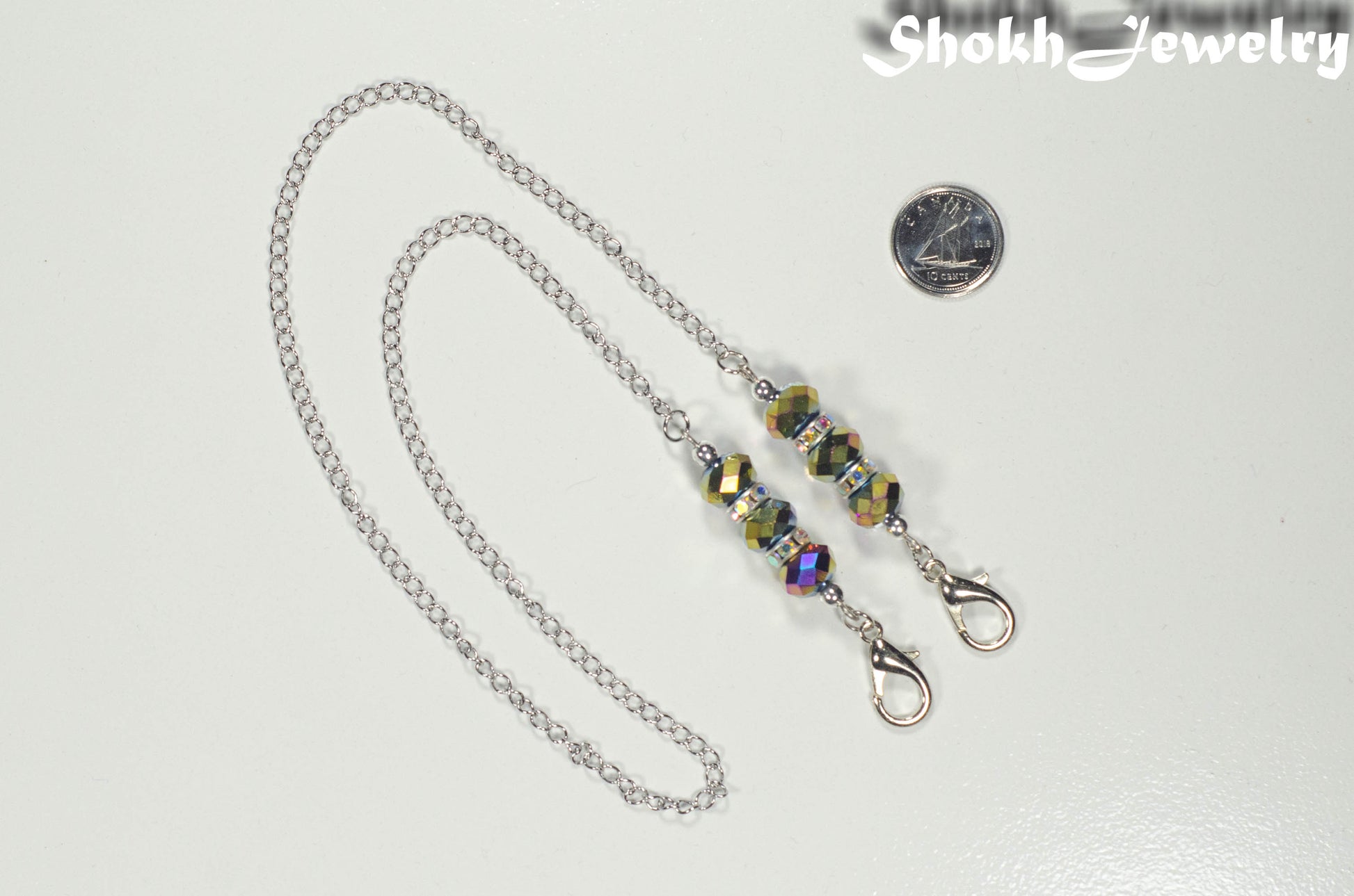 This simple and elegant mask lanyard/eyeglass chain is made with glass crystal and sparkly rhinestone beads, silver plated spacer beads, lobster claw clasps and stainless steel chain. Please choose the colour of the glass crystal beads from the drop down menu.